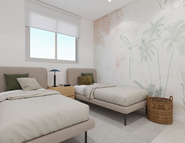 This modern gated residential area features apartments with 2 to 3 bedrooms and 2 full bathrooms. The complex consists of three buildings, each surrounded by spacious garden areas. Residents can enjoy an array of amenities, including a stunning pool equipped with water loungers, a delightful children’s playground, a charming pergola, and convenient bicycle parking.