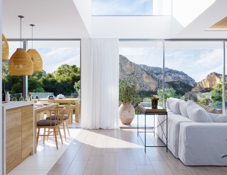 The living area is fitted with floor-to-ceiling windows and doors, offering captivating views of the landscape from every room. The open-plan lounge boasts 3-meter-high ceilings, and the beautifully designed open kitchen features large sliding doors leading to the terrace, making it perfect for family gatherings. The panoramic windows provide spectacular views of the surroundings.