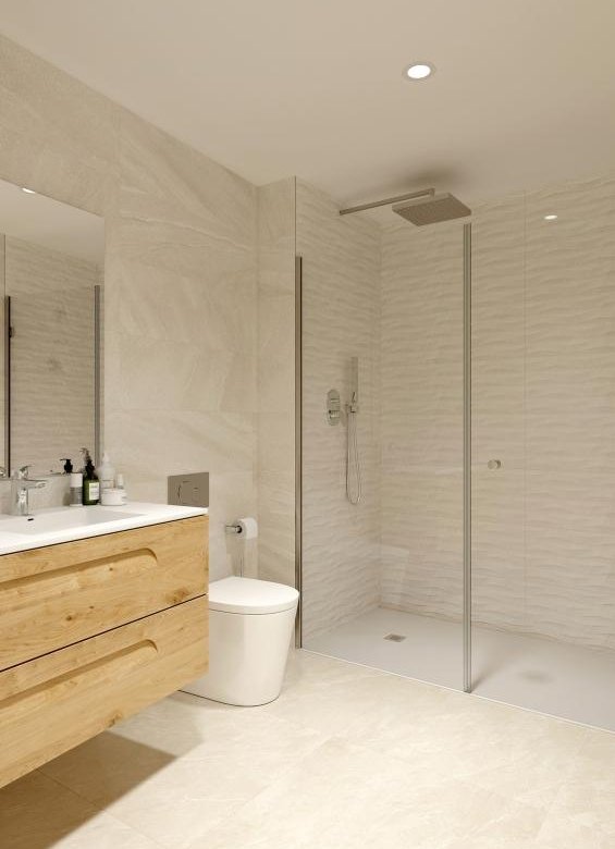 Each apartment boasts a bright and functional design, with open-plan spaces seamlessly integrating the living room and kitchen. You can choose between configurations of two or three bedrooms, with the master suite offering an elegant en-suite bathroom. Additionally, each residence includes two bathrooms in total. From the living room, you’ll step out onto a sunlit terrace with charming views of the surroundings.