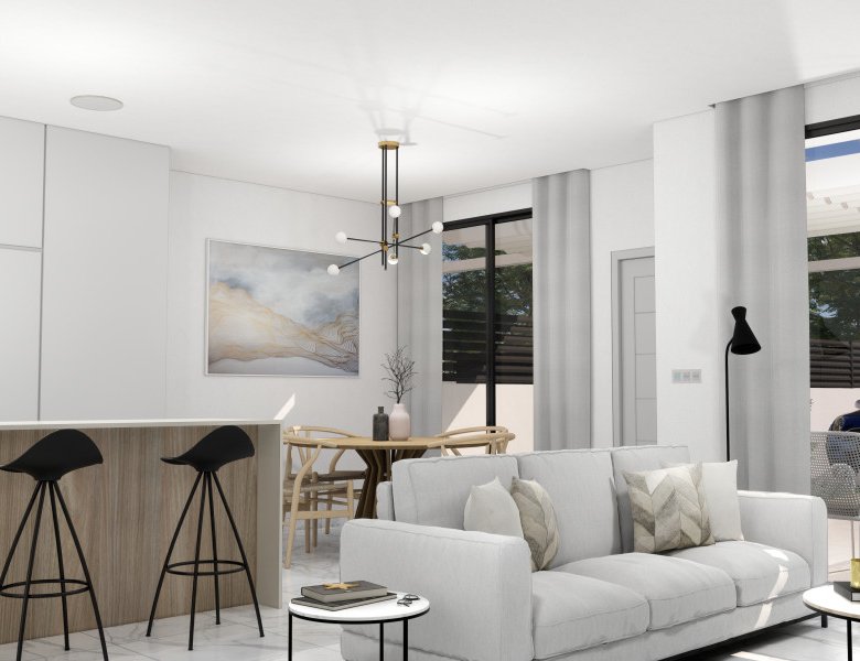 Experience the luxury of these stunning townhouses that span three levels. The ground floor showcases an open-plan kitchen, living, and dining area, complemented by a suite and a guest bathroom. On the first floor, two en-suite bedrooms await, with one granting access to a spacious terrace exceeding 18 square meters. The crowning feature is an optional solarium, nearly 50 square meters in size. Additionally, the option for a private pool enhances the property.
