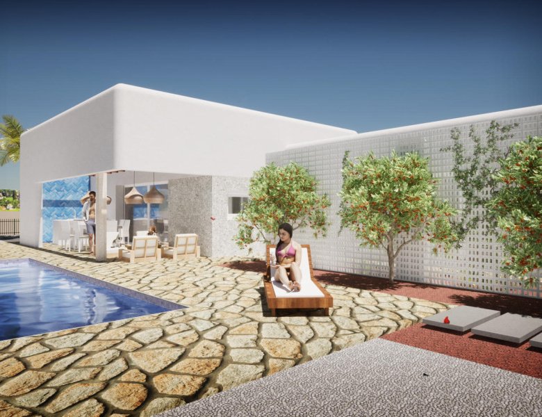 The villa boasts an impressive design, featuring a spacious living area with a higher-than-usual ceiling, creating an expansive living room with an open-plan kitchen and a connected kitchen-dining island. Large sliding glass doors disappear into the walls when opened, providing an uninterrupted flow to the outdoor pool area. This includes a covered section with a concrete roof and masonry walls, forming a delightful outdoor living space.