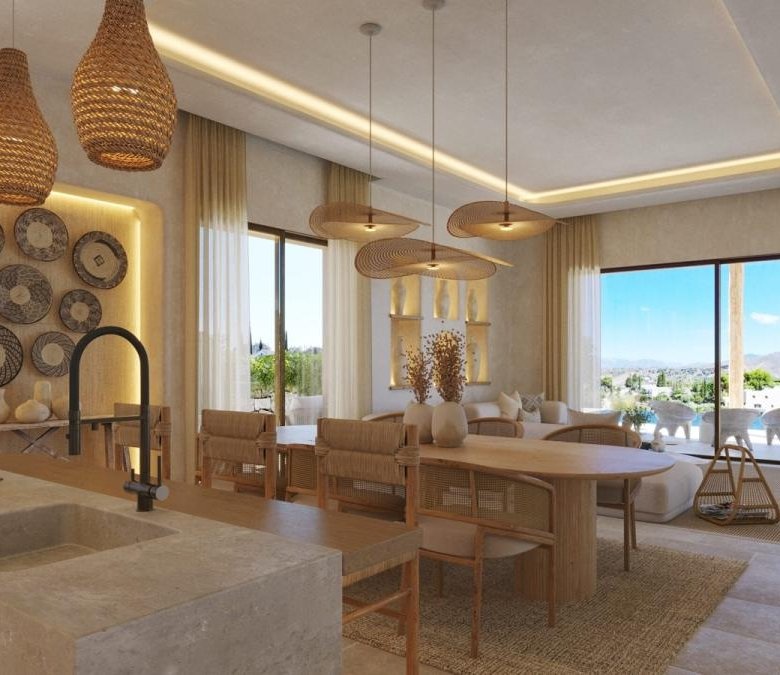 The interior of the residence stands out for its refined style and noble materials, where modern aesthetics meet functionality. The microcement floors and bathrooms provide visual continuity and a sophisticated air, while the aluminium windows with oxidised double glazing maximise natural light and energy efficiency.