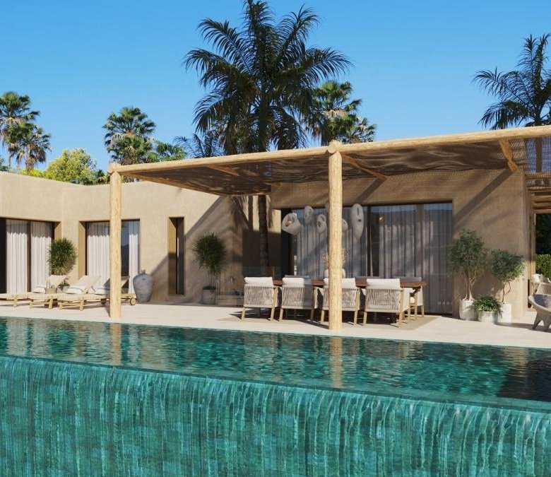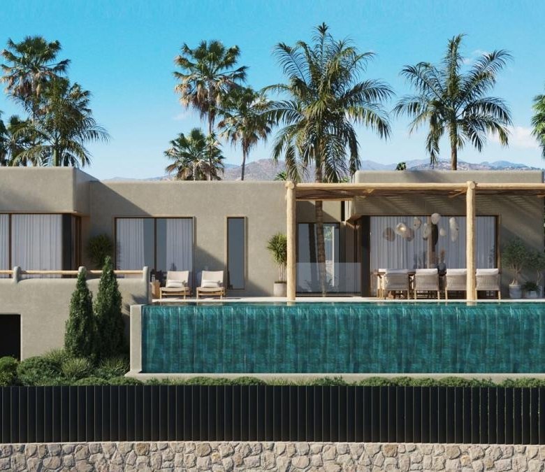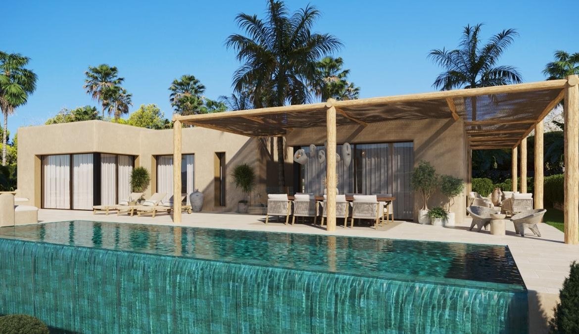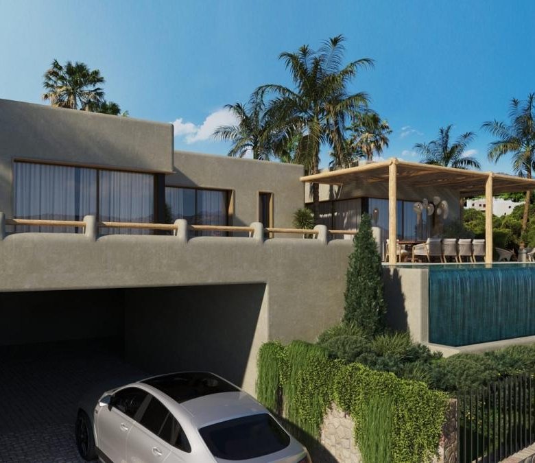 Nestled in a privileged natural setting, this contemporary villa blends Mediterranean character, unique architectural design, and high-quality materials. Its weathered olive green facade and rounded corners give it an unmistakable personality, achieving an elegant and timeless presence in the landscape of one of the most exclusive localities of the Costa Blanca.