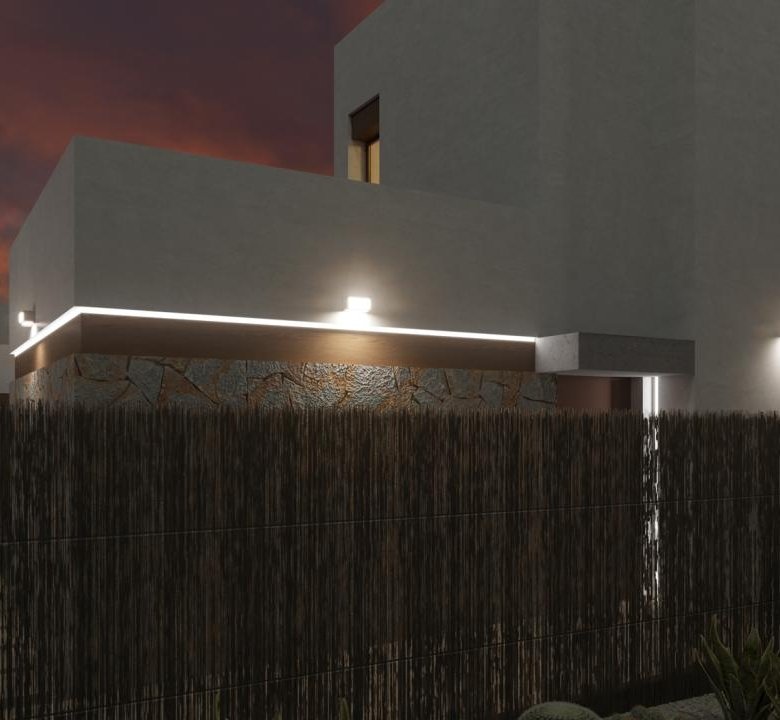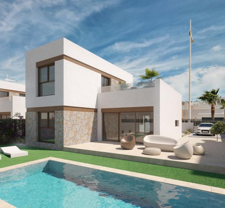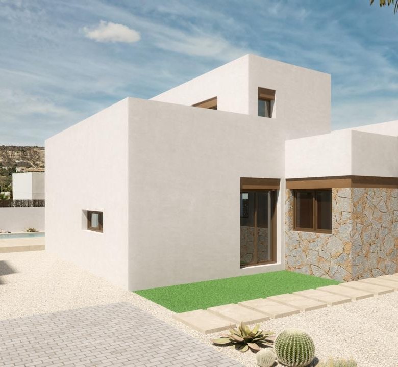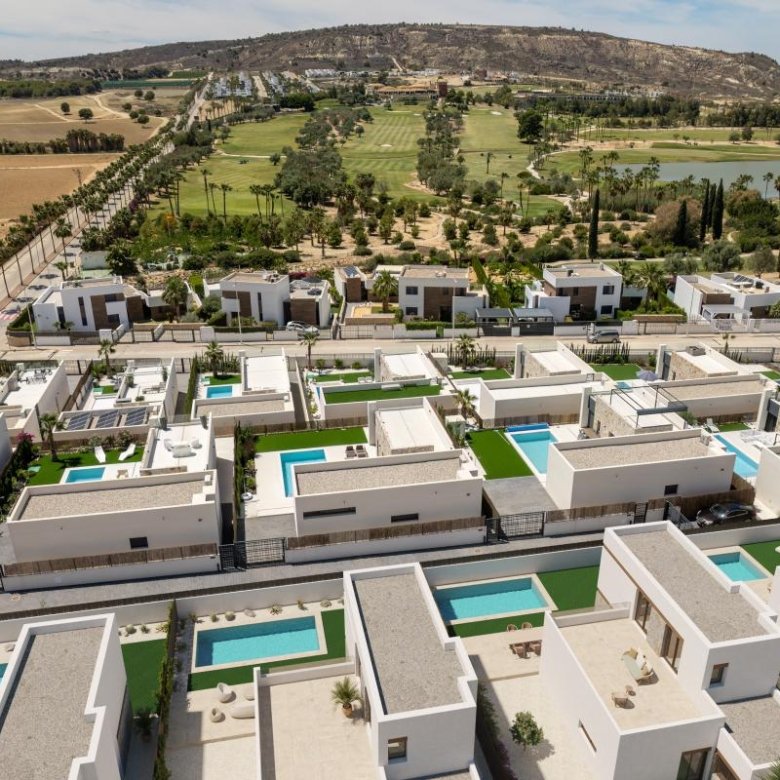 These modern villas, designed on two levels, feature three bedrooms with built-in wardrobes, a family bathroom with a shower, an en-suite bathroom also with a shower, a storage room, and a laundry area. The open-plan kitchen and dining area seamlessly connect to a bright living room. Floor-to-ceiling glass doors in the living area provide direct access to the front and rear terraces, flooding the space with natural light and offering stunning views of the mountains.