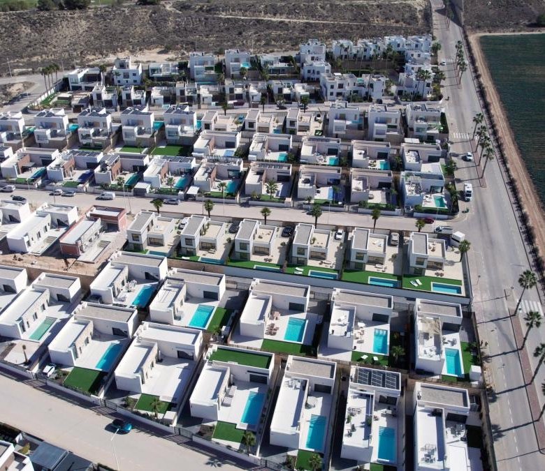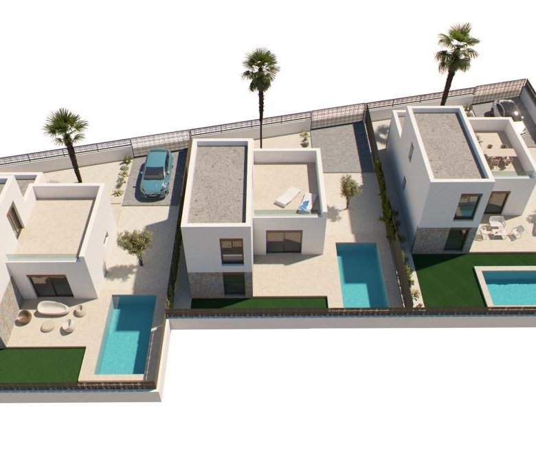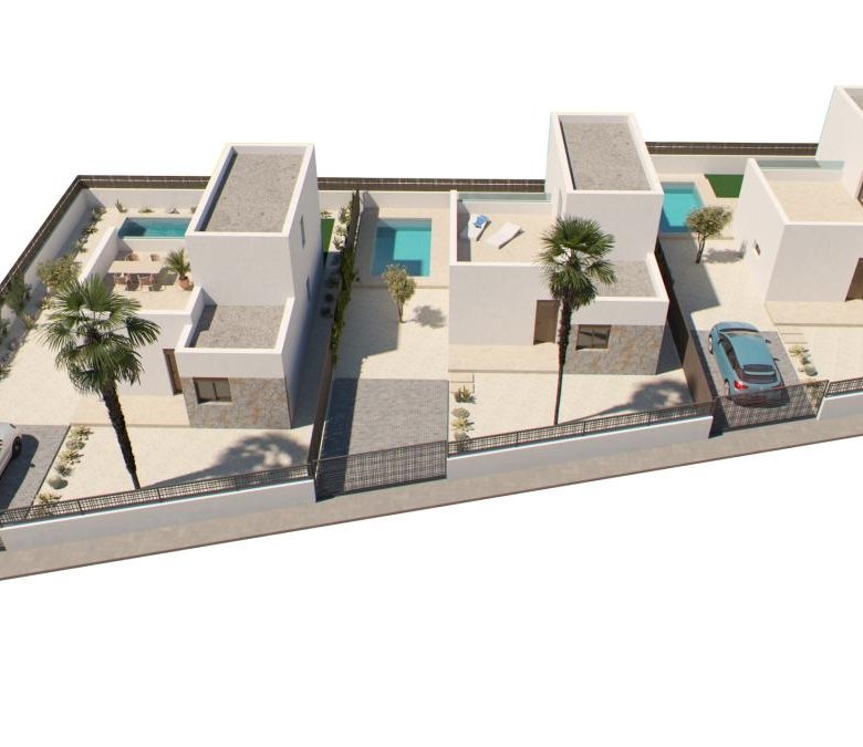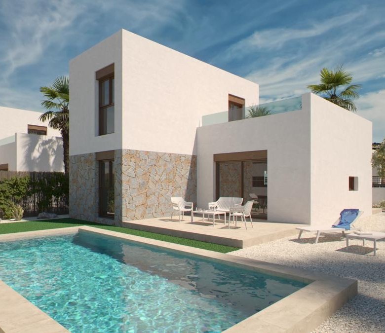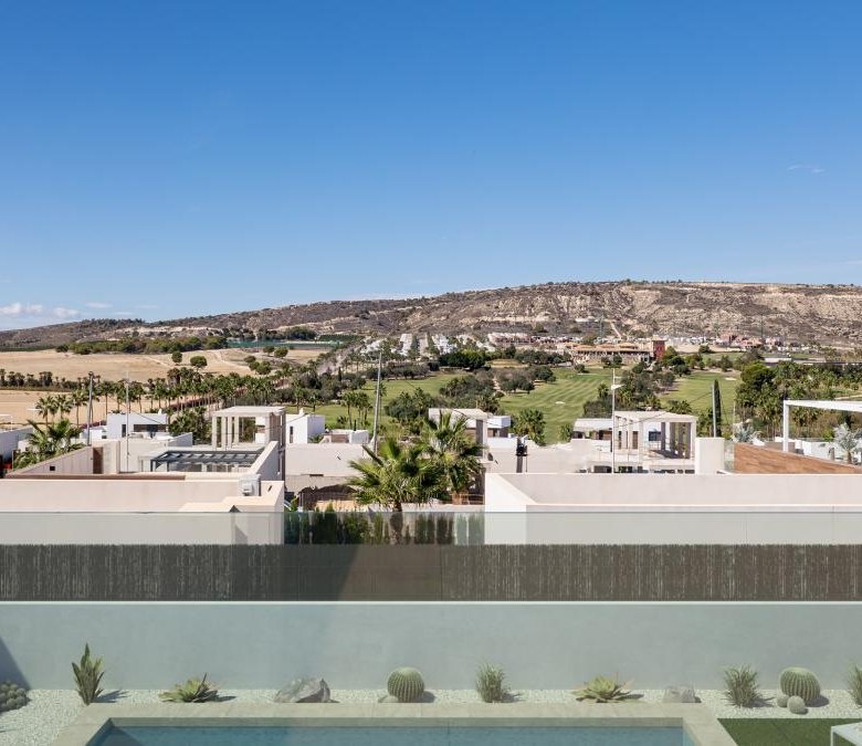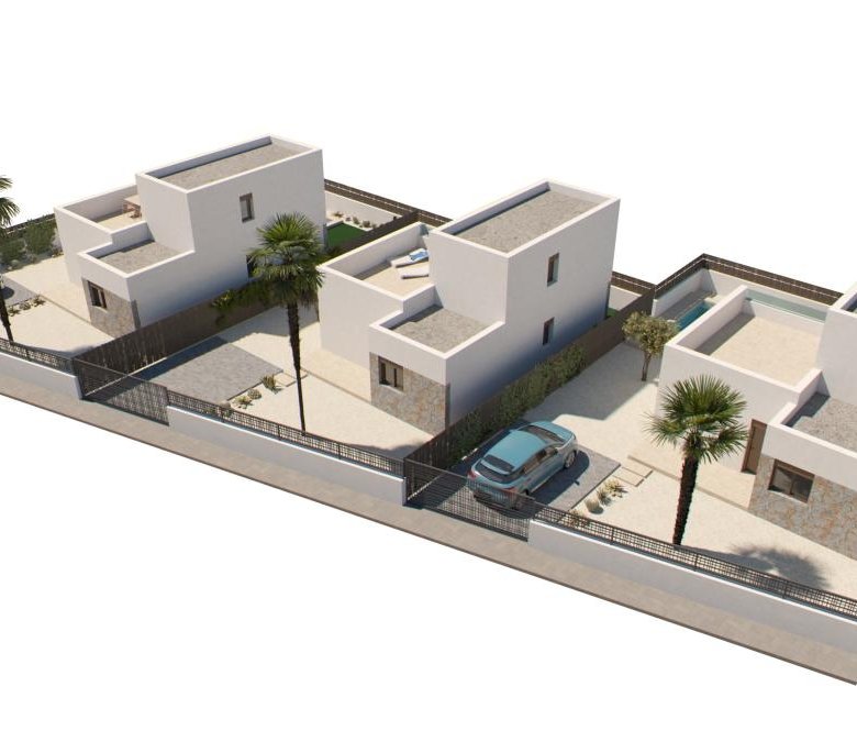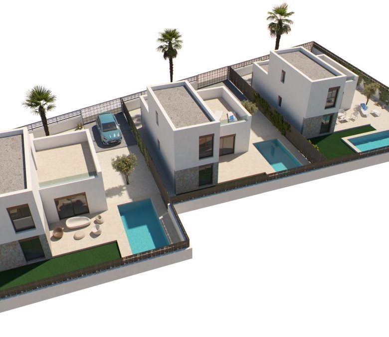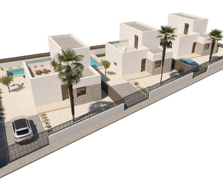 Discover the elegant design of these villas crafted over two levels, each featuring three spacious bedrooms with built-in wardrobes. The layout includes a family bathroom with a shower, an ensuite bathroom, storage, a utility room, and an open-concept kitchen and dining area that flows seamlessly into the living room. Floor-to-ceiling doors in the living area lead directly to front and rear terraces, filling the interior with natural light and offering breathtaking mountain views.