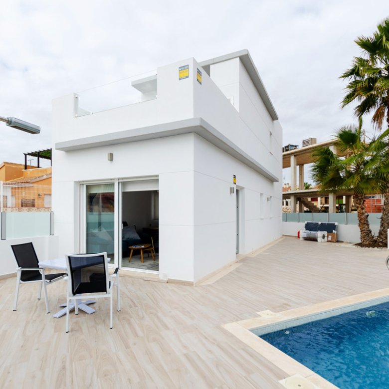 Discover the exquisite Complex, featuring seven newly built, standalone homes nestled in the serene residential area of Torrevieja, Alicante, offering breathtaking views of the charming pink-hued lagoon. Perfectly surrounded by all necessary amenities such as supermarkets, shopping centers, and educational institutions, these villas provide a harmonious blend of comfort and strategic location.