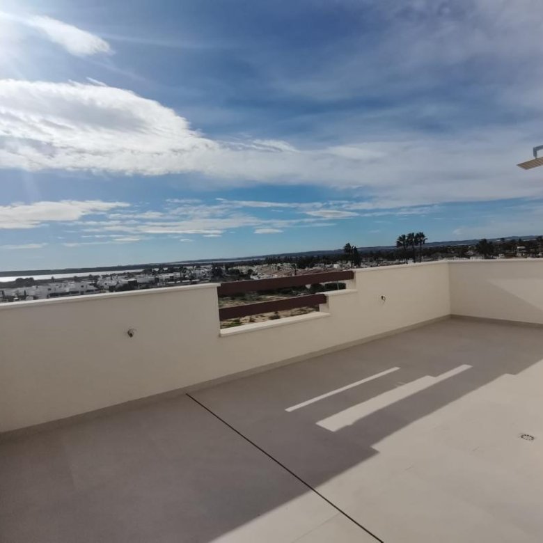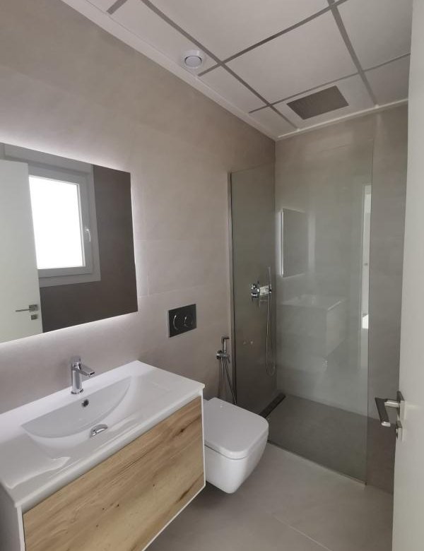 The property features three spacious bedrooms and three full bathrooms, presented in a contemporary and elegant architectural style. On the ground floor, a cozy 12 m² pergola connects seamlessly with the private garden, offering an ideal space for relaxation or outdoor gatherings. The rooftop solarium of 45 m² provides a premium area for sunbathing or admiring clear views.