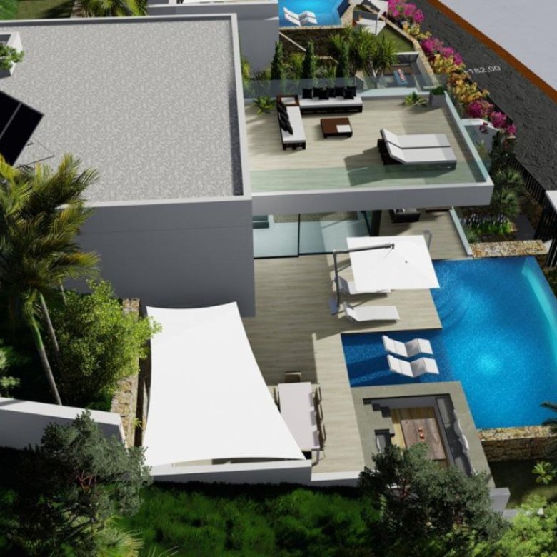 This newly built villa features four bedrooms and five bathrooms, with a total living space of 427 square meters. Situated on a 637-square-meter plot, the home boasts a generous 140-square-meter terrace, providing ample outdoor areas to enjoy the Mediterranean climate.