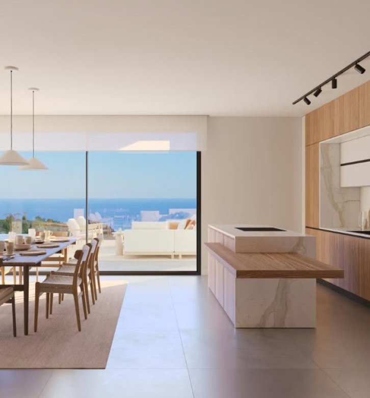 The villa features 4 bedrooms and 6 bathrooms, all with high-end finishes and a layout that prioritises natural light and views. The spacious and open-plan interior spaces combine elegance and functionality, with a main living room that opens to the outside through floor-to-ceiling windows, integrating the dining area and kitchen into a single, fluid, and inviting space. The kitchen, equipped with state-of-the-art appliances, boasts a sophisticated design with natural wood and marble finishes, including a central island that encourages social interaction.