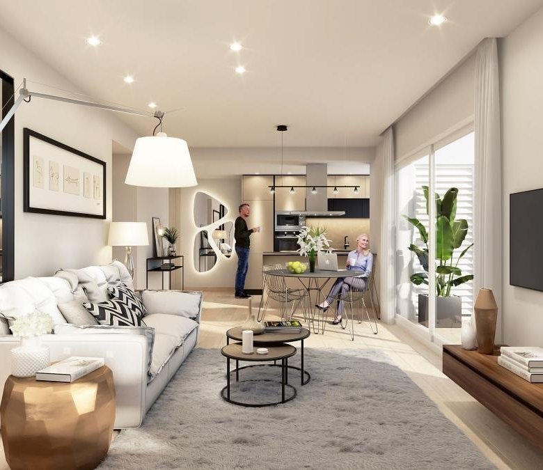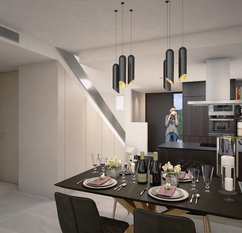 The elegant three-bedroom townhouses offer the highest comfort in a modern two-storey design. Ground floor units feature a private garden, while the penthouses provide solariums accessible from the living room, perfect for enjoying the natural surroundings. The stylish and functional kitchens are equipped with top-quality materials, highlighting an open-plan kitchen that promotes a welcoming and friendly atmosphere.