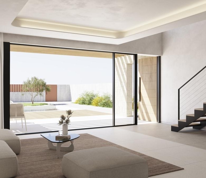This villa is designed as a fully walkable space, incorporating both interior and exterior pathways that allow independent access to each floor. The architectural complex and its surroundings offer varied perspectives, set against the backdrop of the sparkling sea and the stunning Sierra Cortina.