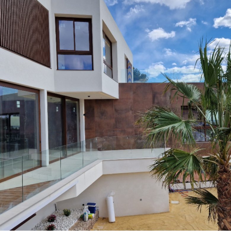 This contemporary villa, situated in Alicante, has been crafted to the highest quality standards in every aspect, both inside and out. Its impressive three-meter high windows are a standout feature throughout the property, allowing abundant natural light to fill each room. When opened, they offer refreshing breezes and breathtaking views. The interior is defined by its exclusive design and luxurious ambiance.